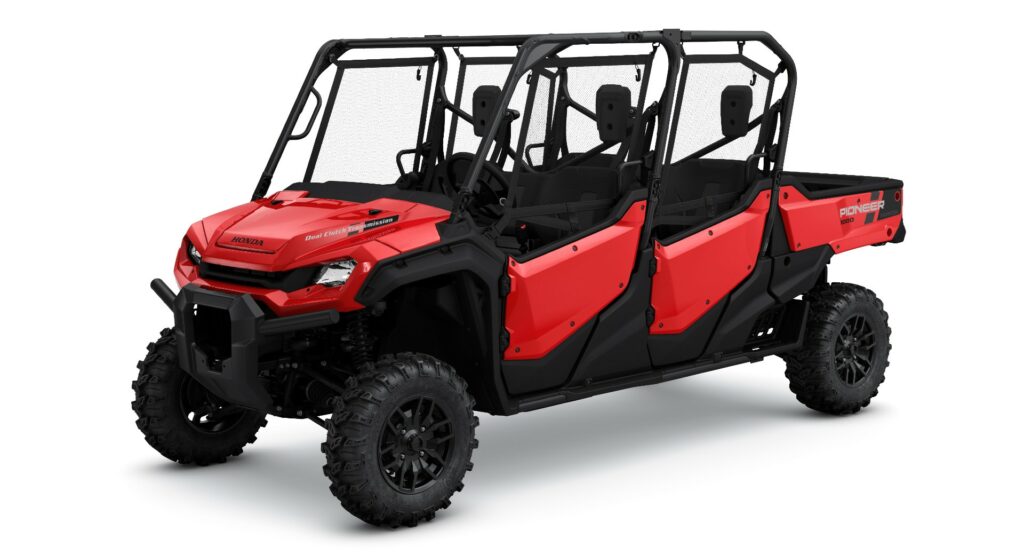 The four-door Pioneer 1000-6 Crew measures 152.2 inches (3,866 mm) long, 63 inches wide (1,600 mm) wide, and 76.1 inches (1933 mm) tall, with a wheelbase of 115.2 inches (2,926 mm). This makes it 35,1 inches (892 mm) longer than the two-door Pioneer 1000. The stretched wheelbase results in 28 inches (711 mm) of legroom which according to Honda is best-in-class. Besides the full-size rear bed, there is also under-seat storage in both rows.