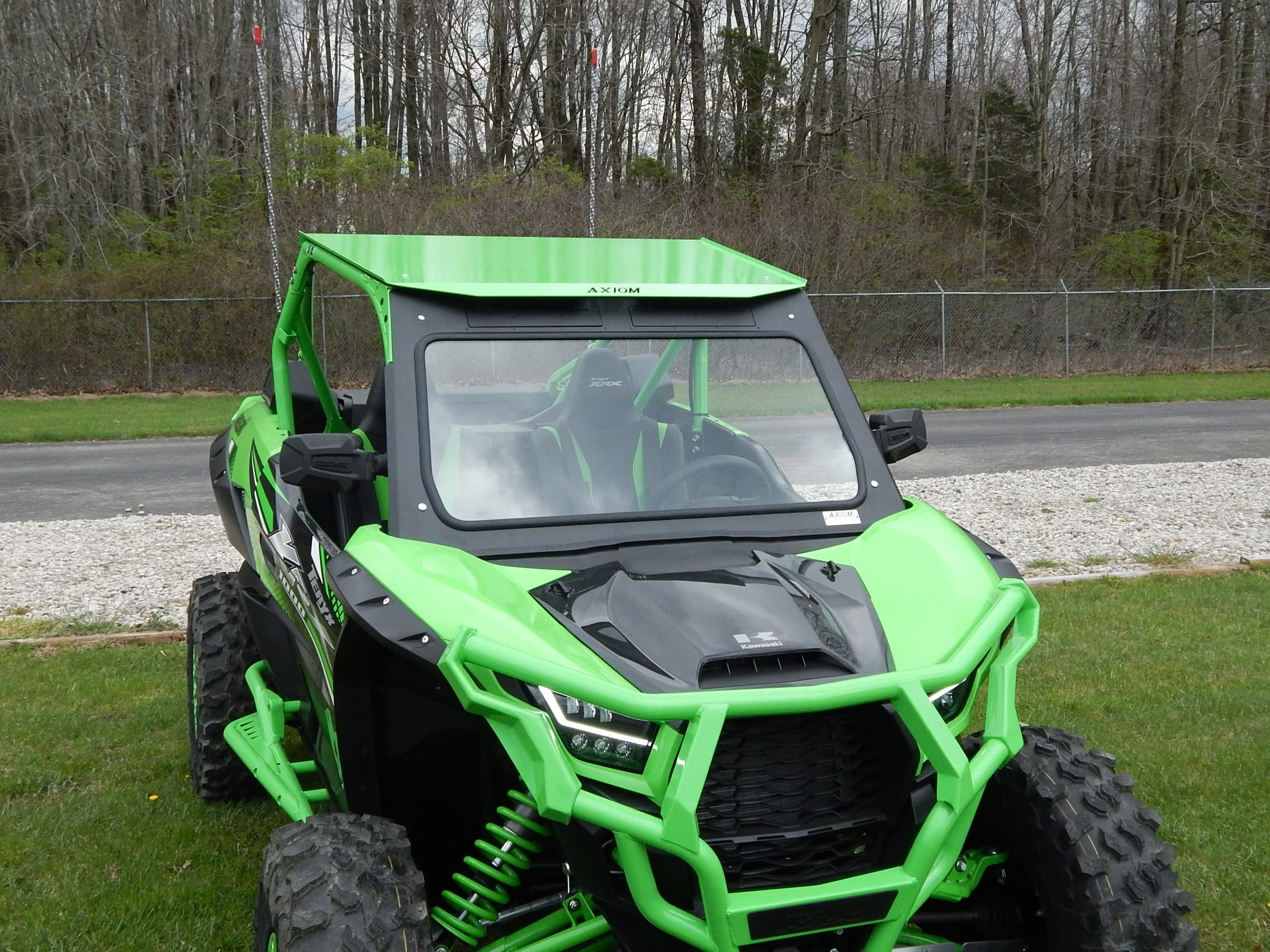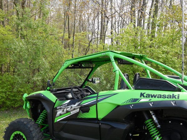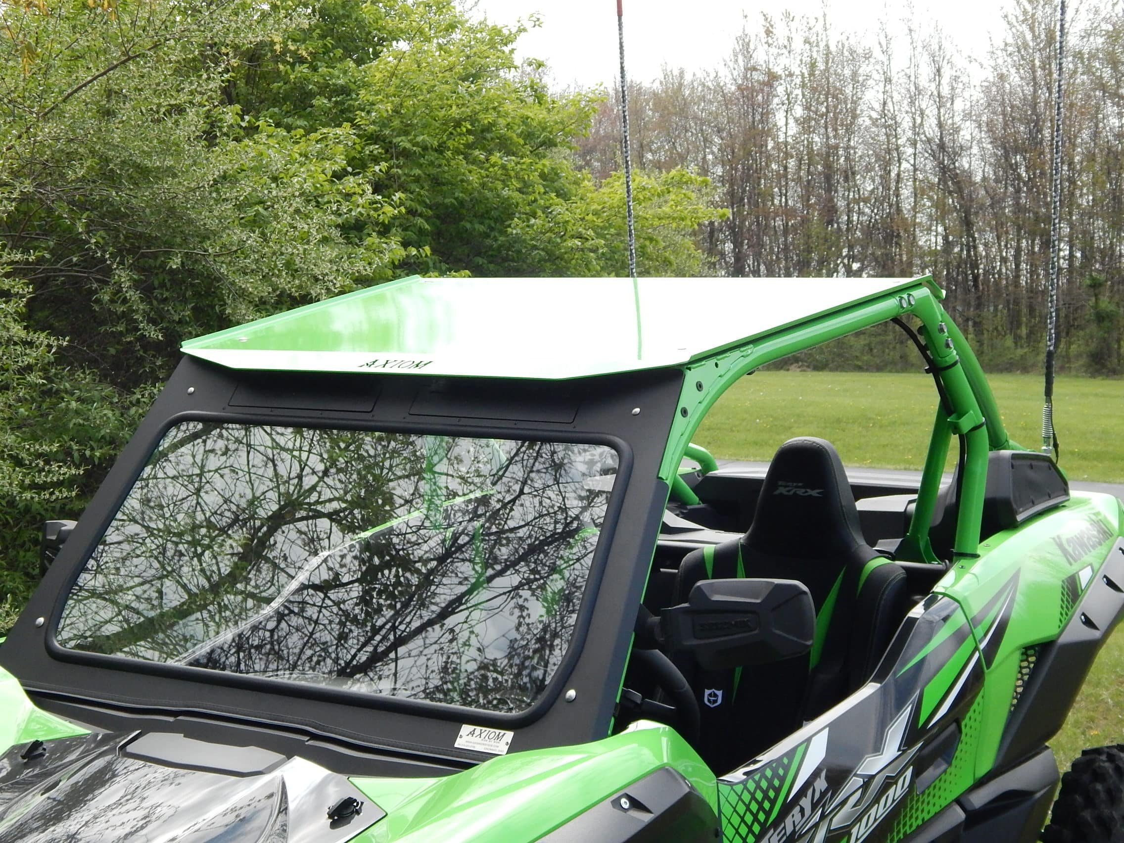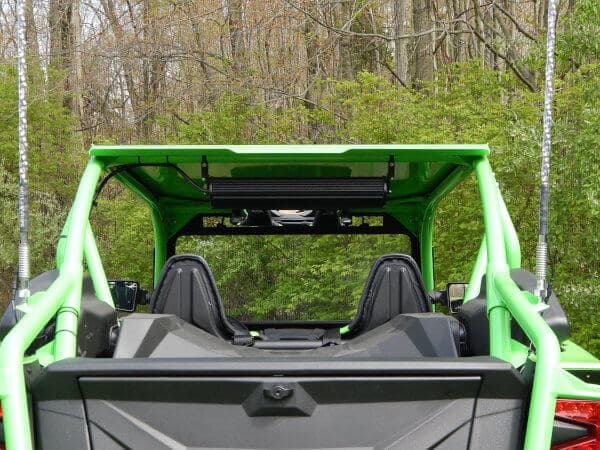 Our KRX roof is made from 1/8” aluminum and includes a durable powder coat finish. It features a one piece construction, formed side gutters to prevent dripping water and an integrated visor. Will not crack or fade like plastic roofs. It includes factory  installed cushioning gasket and all installation hardware. Available in Satin Black, Kawasaki Green and raw. Additional colors available on request.