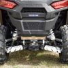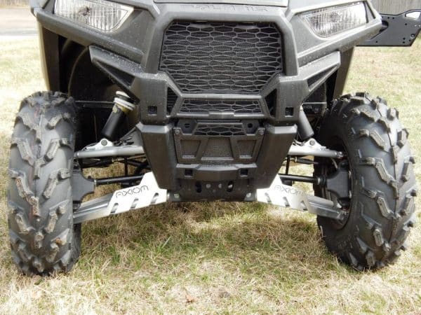 These great looking guards are made from .160 (5/32”) thick aluminum and feature our signature brushed finish. They protect your A-Arms and CV boots from damage caused by logs, rocks, stumps and more. Drainage holes prevent you from carrying excess mud and make cleanout easier. Square shouldered low profile bolts prevent heads from shearing off no matter how rough the trail gets. Easy installation with NO drilling or mods to your machine. All installation hardware included.