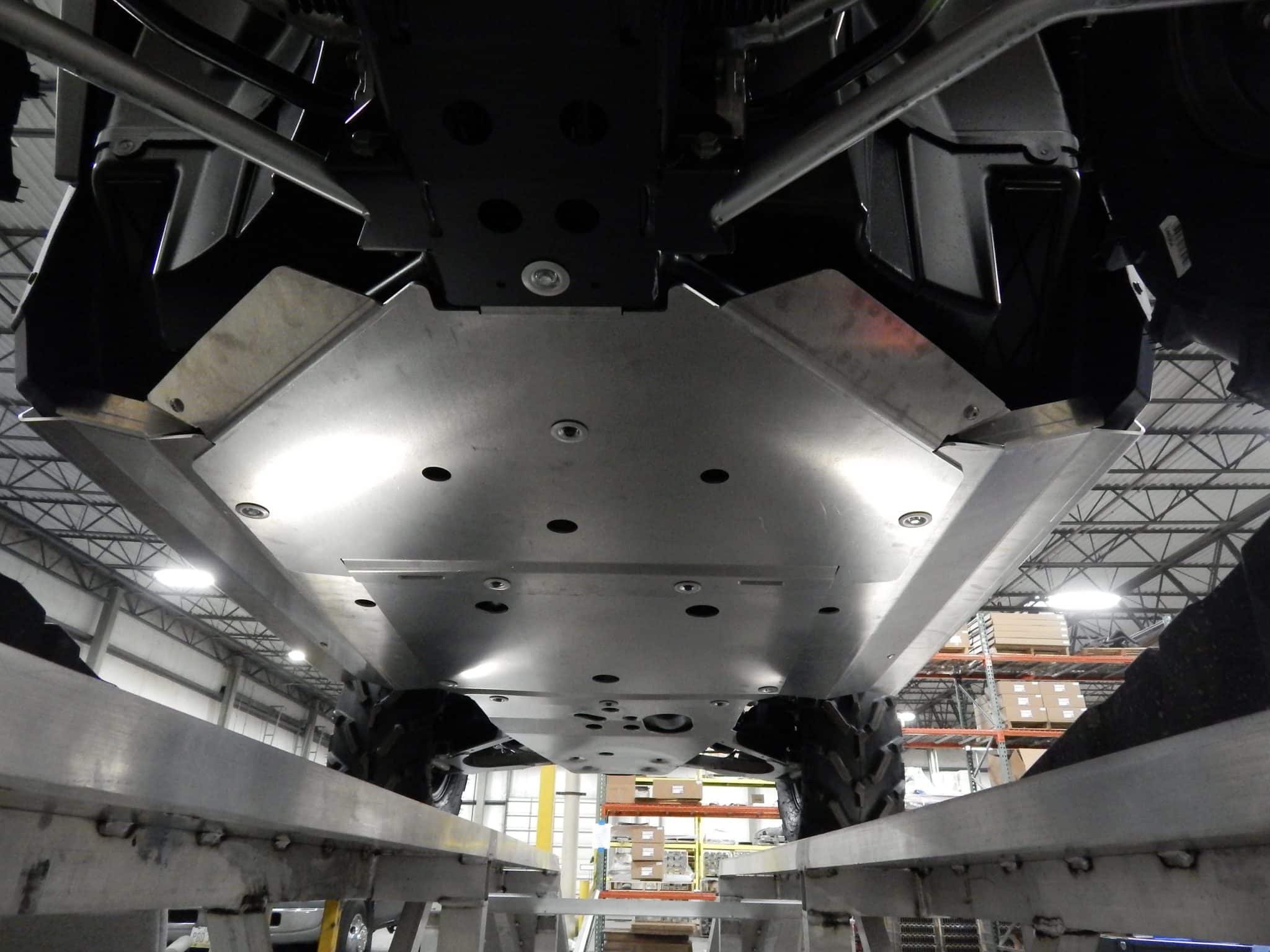 This skid plate has cutouts for use with Polaris tree guards.  Skid plate is made from .160 (5/32″) aluminum and feature formed in Rock Sliders and our signature brushed finish. Bolt-on installation with no drilling or modifications to your vehicle. Access holes are provided for maintenance and drainage. Mounting bolts are recessed with stainless steel skid plate washers to prevent shearing off bolt heads.